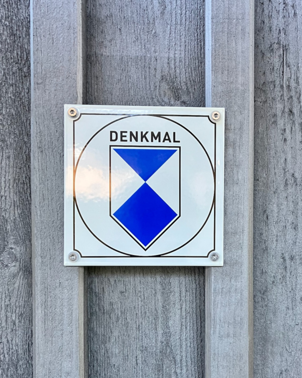 Die Plakette ist 150 × 150 mm groß und einbrennlackiert, sodass eine lange Haltbarkeit garantiert ist. Sie trägt das blaue Rautenmotiv in schwarzem Rahmen auf weißem Grund und den Schriftzug »Denkmal«.