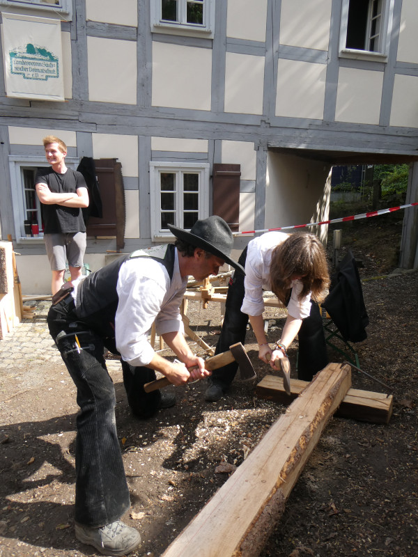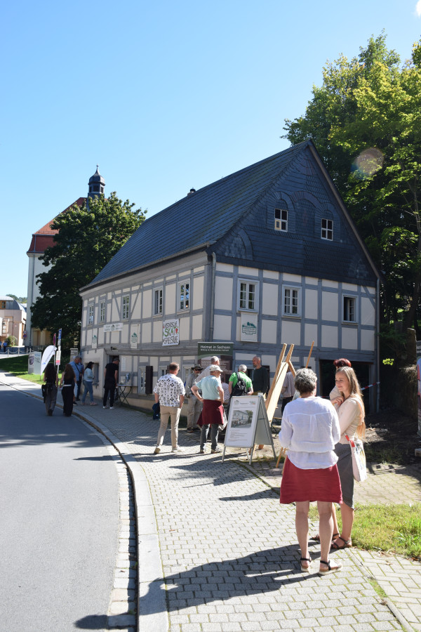 Das Denkmalnetz Sachsen und der Landesverein Sächsischer Heimatschutz gestalteten vom 5. bis 7. September 2025 das Informationsforum für Denkmalpflege am Fachwerkhaus auf der Pfarrgasse. Vielfältig war das Programm: Vorträge zur Baugeschichte des Hauses und seiner Sanierung, Vorführungen historischer Handwerkstechniken – Schindelherstellung, manuelle Schrotsäge, Lehmarbeiten – begeisterten hunderte Zuschauer:innen. Auch Staatsministerin Regina Kraushaar konnte der Verlockung mit Holz zu arbeiten nicht widerstehen und arbeitete gemeinsam mit Robin Linder an neuen Schindeln. Weitere Vorträge zur Frage „Umnutzung statt Abriss“ mit dem Zentrum für Baukultur Dresden und Alexander Pötzsch, Vorsitzender des BDA sowie zum Thema „Baukonstruktive Untersuchungen am Denkmal“ Beispielhaft vorgestellt am Pumpspeicherwerk Niederwartha durch Student:innen des Lehrgebietes Baukonstruktion und Bauwerkserhaltung und Professor Thomas Naumann von der Hochschule für Technik und Wirtschaft Dresden fanden interessierte Zuhörer:innen und es gab im Anschluss rege Diskussionen.